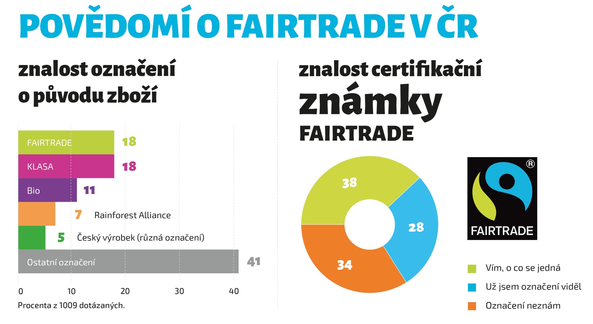 V dubnu jsme si u společnosti Median opět nechali zpracovat průzkum, v němž jsme zjišťovali znalost certifikace Fairtrade a známky FAIRTRADE. Pokud jde o povědomí o známce FAIRTRADE, podle průzkumu ji zná 66 % českých spotřebitelů, 38 % respondentů uvedlo, že přesně ví, co toto označení znamená. Pro srovnání v roce 2011 znalost známky FAIRTRADE v ČR podle průzkumu společnosti INESAN činila 21 %.