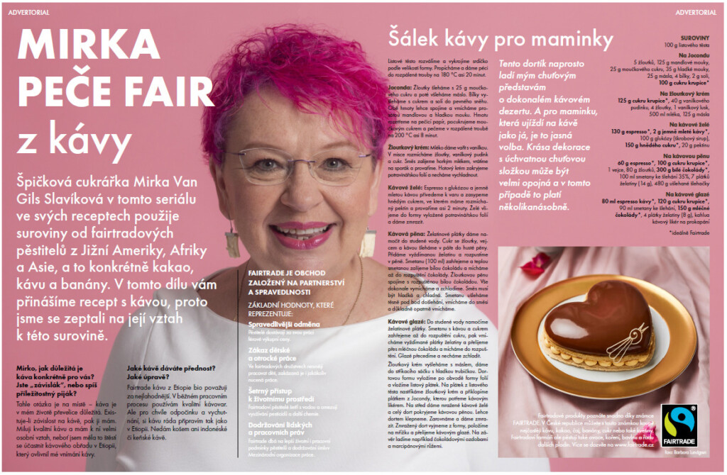 Cukrářka Mirka Van Gils Slavíková se zapojila do komunikační podpory Fairtrade na sociálních sítích a v novém seriálu v magazínu FOOD ve svých receptech peče ze surovin od fairtradových pěstitelů z Latinské Ameriky, Afriky a Asie, a to konkrétně z kakaa, kávy a banánů. Při této příležitosti jsme ji vyzpovídali, jaký je její vztah k surovinám.
