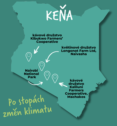 Naše první návštěva v Keni směřovala do fairtradového družstva Kibukwo Farmers’ Cooperative Society v pohoří Nandi. Podívali jsme se na dvě rodinné kávové farmy, jedna patří Viole Chameli, druhá Williamu Togomovi. A jak konkrétně zde dopadá klimatická změna? Viola kvůli stále čím dál vyšším teplotám vysazuje mezi kávovníky stromy, které je zastiňují a chrání před silným sluncem. William bojuje na své farmě s půdní erozí tím, že ve svazích buduje terasy. Oba také nahrazují své kávovníky novou, odolnější odrůdou vyšlechtěnou přímo v Keni.